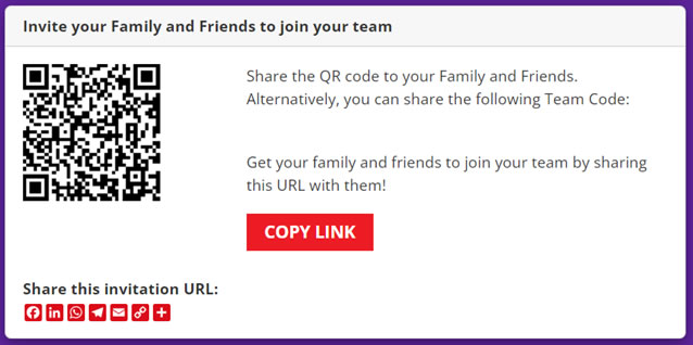 Please note that one email address can only be used to register for one account (participant). Each participant will need to have their own account to participate in the event.For Team Leaders, login to your profile, scroll to the bottom and under 'Invite your Family and Friends to join your team', click 'COPY LINK' or share the invitation URL through various channels.